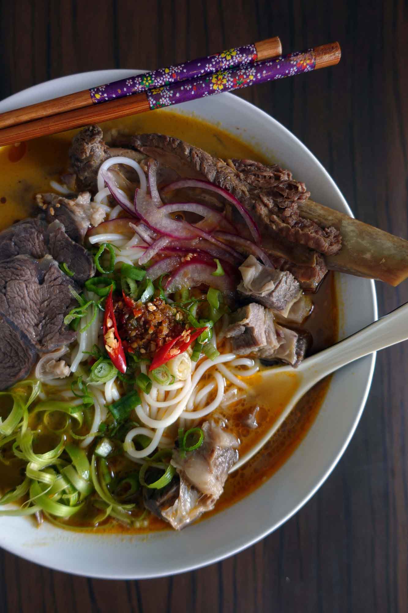 12. To serve, put together cooked vermicelli, sliced meat and broth then garnish with chopped green onion, sliced onion and chopped Vietnamese coriander.