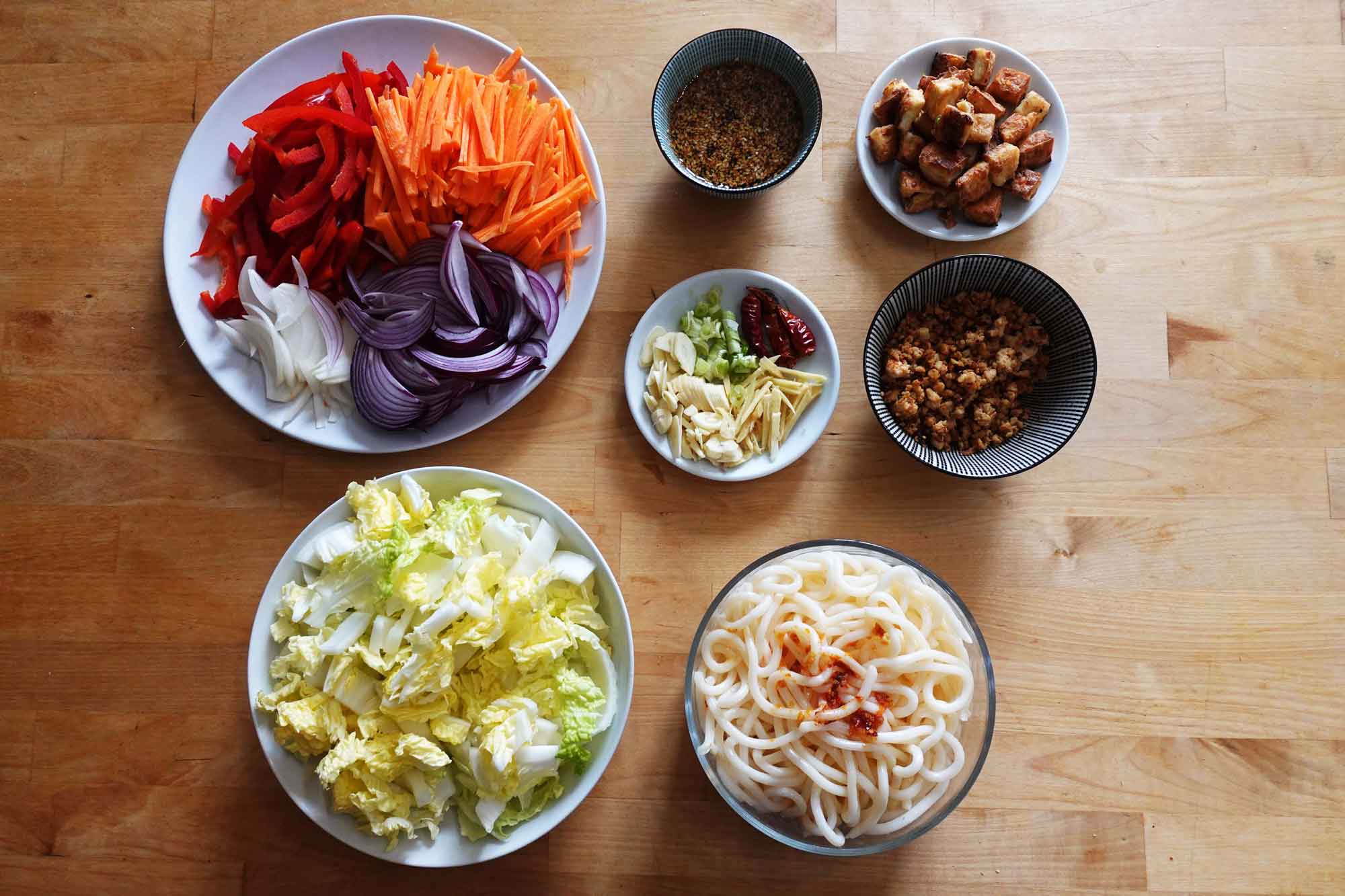 - Prepare the vegetables: chop white onion, chopped red pepper, chopped carrots, chopped chinese cabbage.